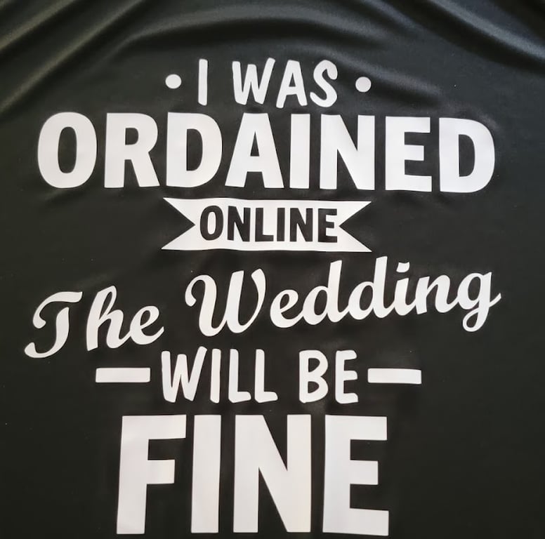The image features a black fabric with bold white text that reads, "I was ordained online. The wedding will be fine.