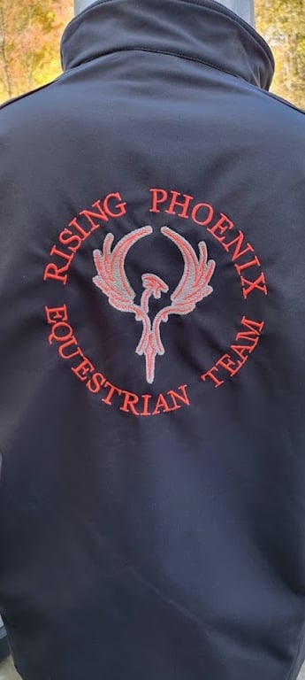 The image features a black jacket with an embroidered logo of the "Rising Phoenix Equestrian Team" in red. The design includes a stylized phoenix, symbolizing strength and unity.