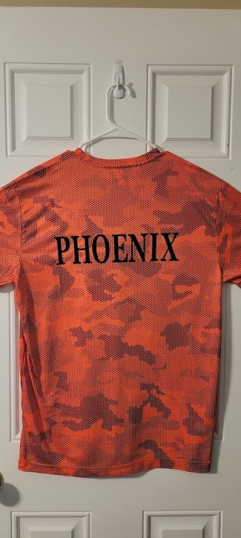 The image features a vibrant orange camouflage sports shirt hanging on a door. The back of the shirt prominently displays the word "PHOENIX" in bold black letters.
