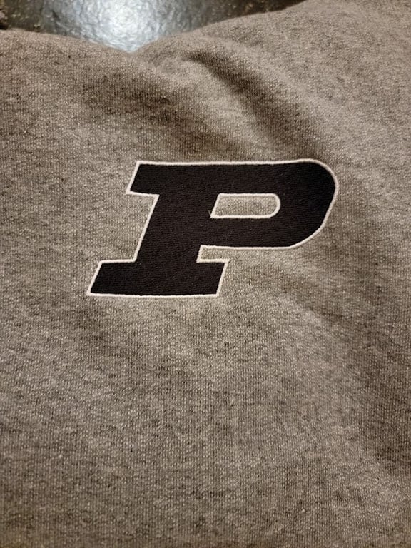 The image features a close-up of a gray fabric with a prominent black embroidered letter "P." This detail highlights the store's focus on custom embroidery services.