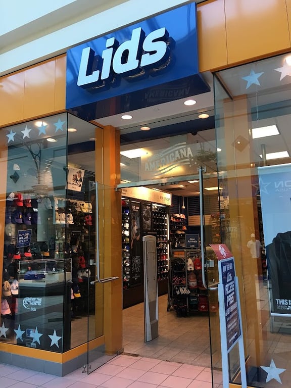 The image shows the entrance of Lids, a retail store featuring sports hats and apparel.