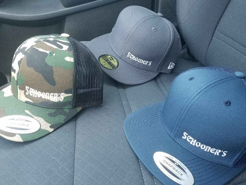 Three stylish caps are displayed on a car seat, featuring a camouflage design, a solid gray, and a navy blue option. Each cap showcases the brand "Schooner's" prominently.