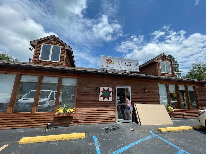 The image shows the exterior of Quiltbug, a sewing store with a wooden facade and a welcoming entrance.