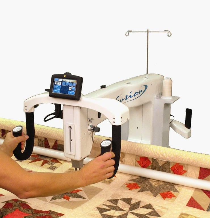 A person operates a Fusion quilting machine, guiding it over a colorful quilt with intricate patterns.