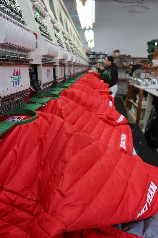 The image shows a sewing store interior with multiple embroidery machines in action, stitching red jackets.