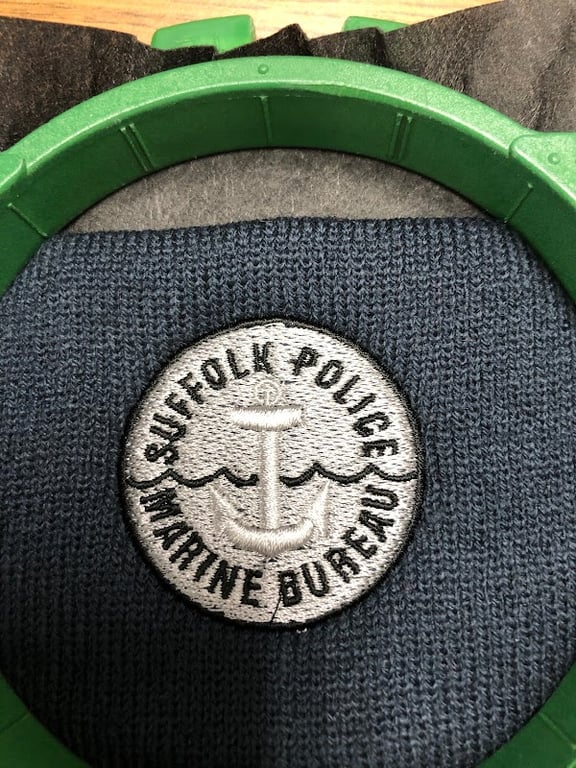 The image features a close-up of a Suffolk Police Marine Bureau patch being embroidered on dark fabric, framed by a green embroidery hoop.