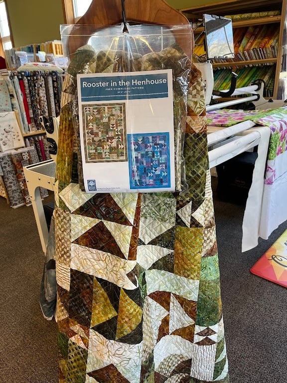 The image features a quilted display of the "Rooster in the Henhouse" pattern, showcasing intricate green and brown fabrics.