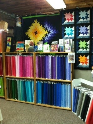 The interior of Tiger Lily Quilt Co features colorful quilts and fabric displays hanging from the ceiling.