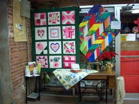 The image showcases a cozy sewing store interior featuring colorful quilts displayed on the walls, including floral and geometric patterns.