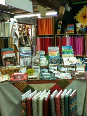 The image showcases a cozy sewing store interior featuring colorful quilts displayed on the walls.