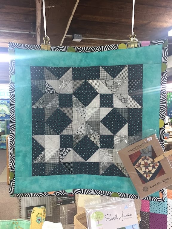 The image showcases a vibrant quilt displayed in a sewing store, featuring a geometric pattern in black, white, and teal.