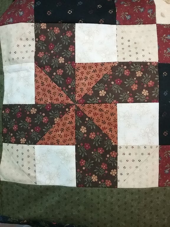 The image features a beautifully crafted quilt with a star pattern, showcasing a mix of floral and geometric fabrics in warm tones.
