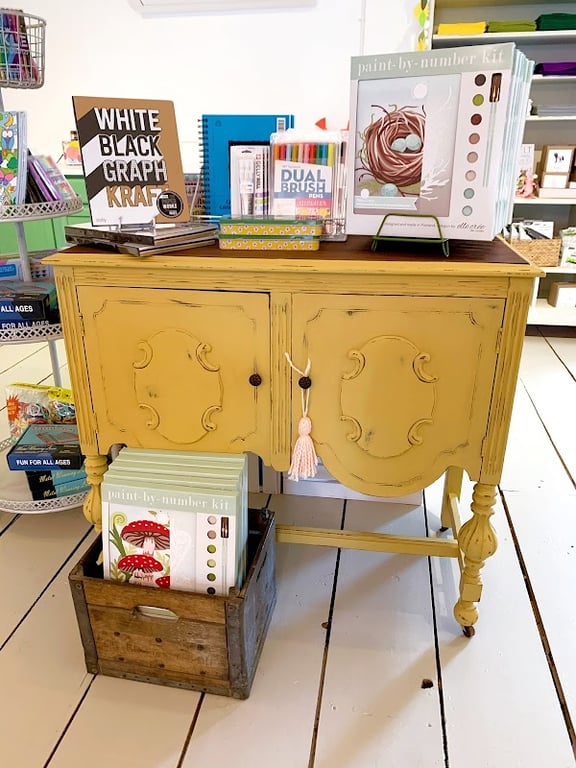 The image showcases a vibrant sewing store interior featuring a charming yellow cabinet displaying various art supplies, including dual brush pens and paint-by-number kits.