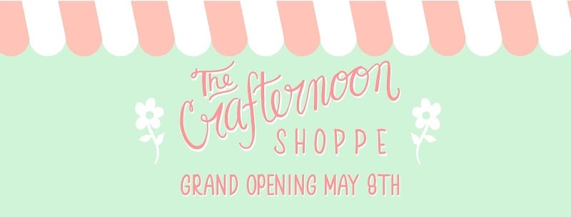 The image features a charming storefront sign for The Crafternoon Shoppe, announcing its grand opening.