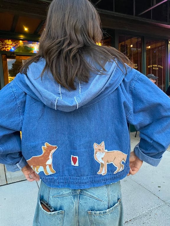 A person stands outside wearing a denim jacket adorned with colorful fox patches and a heart. The setting features a vibrant storefront, adding a creative touch to the outfit.