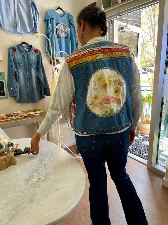 A woman stands at a marble table in a sewing store, wearing a colorful, handmade denim vest with floral designs.