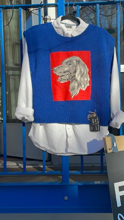 A vibrant blue sweater featuring a dog illustration is displayed over a white collared shirt, showcasing unique handmade apparel.