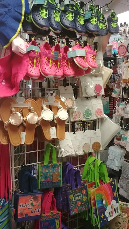 The image showcases a vibrant display of children's footwear, including colorful sandals and crocs, alongside various accessories like bags and decorative items.