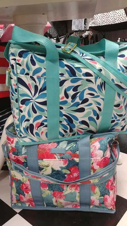 The image features two stylish sewing bags displayed in a vibrant sewing store. The top bag has a colorful, abstract pattern, while the bottom bag showcases a floral design.