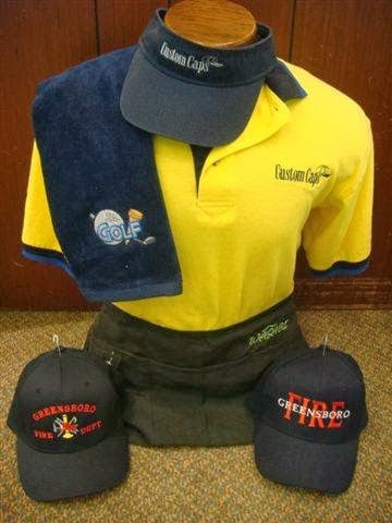 The image showcases a display at Custom Caps Shirts & More, featuring a yellow polo shirt, a blue towel, and three embroidered caps.