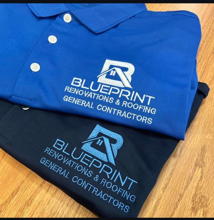 The image features two embroidered polo shirts, one blue and one black, both displaying the logo and text for "Blueprint Renovations & Roofing.