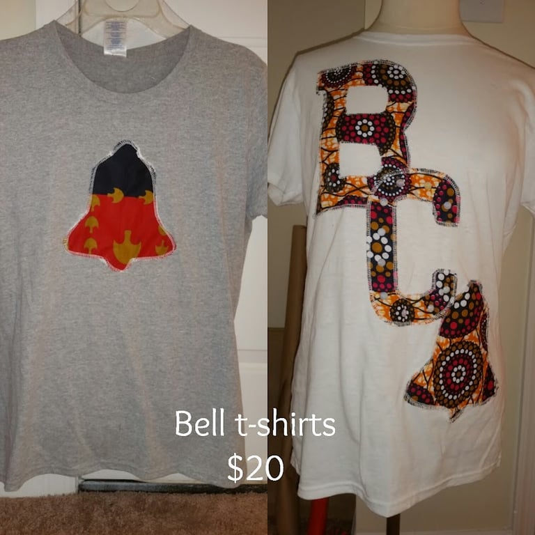 The image features two creatively designed t-shirts displayed in a sewing store.