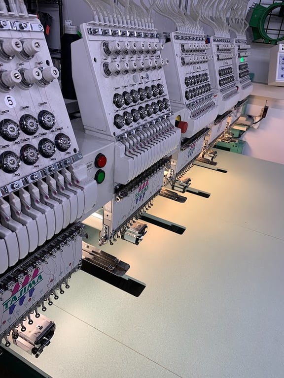 The image showcases multiple embroidery machines lined up in a well-lit sewing store.