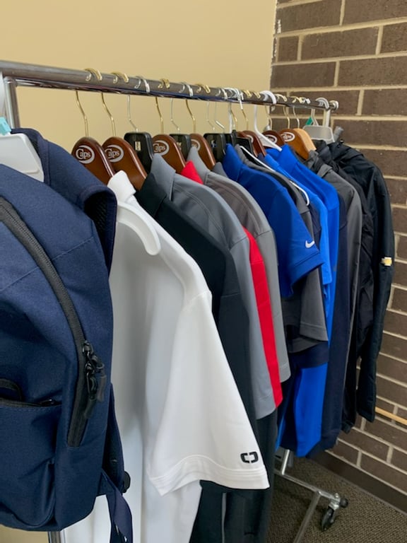 The image showcases a display rack filled with various polo shirts and jackets in different colors, including white, gray, red, and blue.