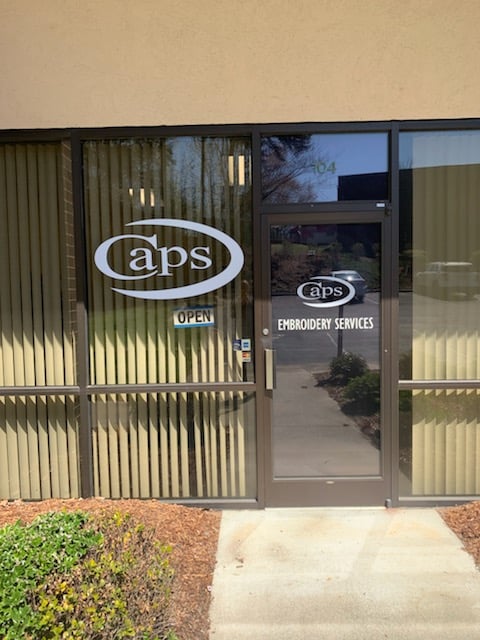 The image shows the entrance of CAPS Embroidery Services, featuring a glass door with the store's logo and an "Open" sign.