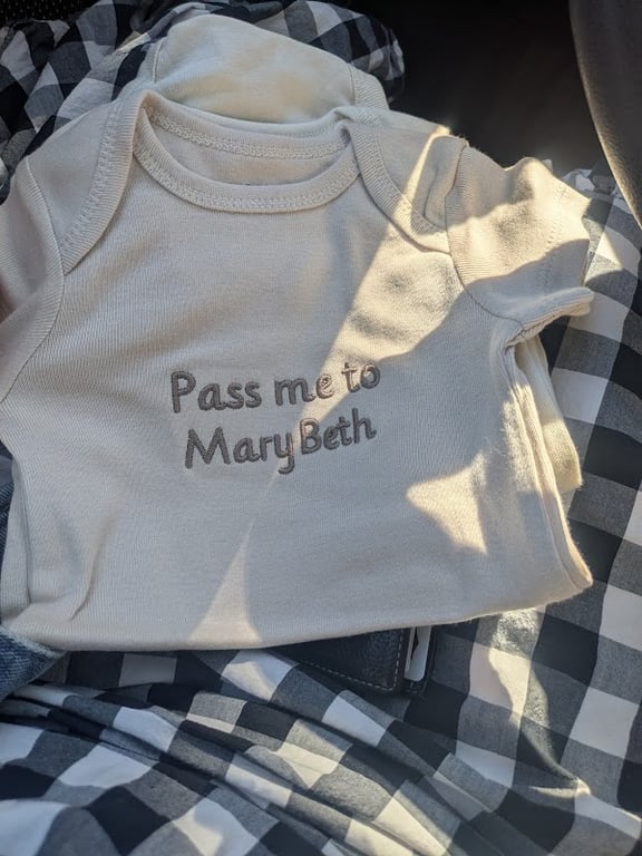 A light-colored baby onesie with the embroidered text "Pass me to MaryBeth" is displayed on a checkered fabric background.