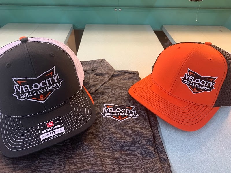 The image showcases two embroidered hats and a shirt featuring the "Velocity Skills Training" logo.