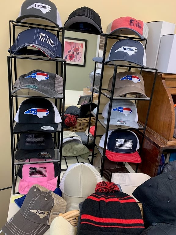 The image showcases a variety of hats displayed on metal racks in a sewing store. The hats feature designs representing North Carolina and patriotic themes.