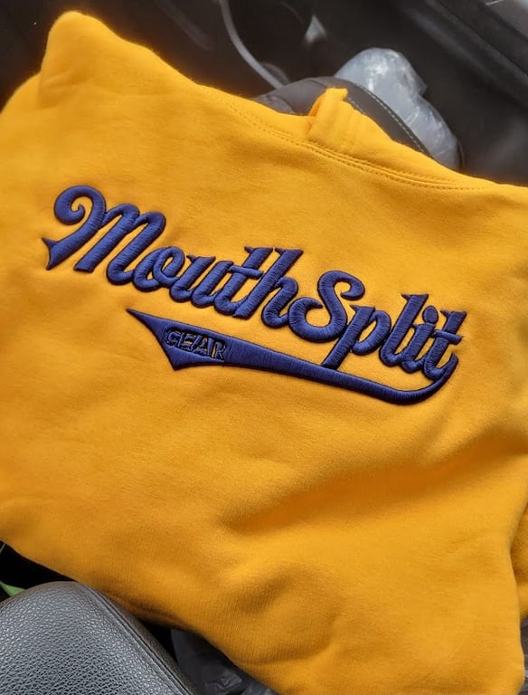 A vibrant yellow sweatshirt with "MouthSplit" embroidered in purple is displayed on a surface, showcasing the quality of custom apparel available at 725 Print Lab.