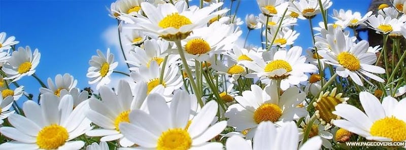 The image features a vibrant display of white daisies with yellow centers against a clear blue sky. The flowers are densely packed, creating a lively and cheerful atmosphere.