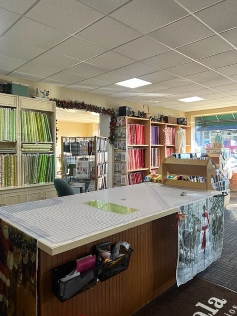 The interior of Lee Sewing Center features colorful fabric bolts neatly arranged on shelves, with a central display table showcasing sewing patterns and supplies.