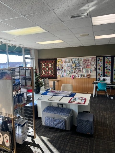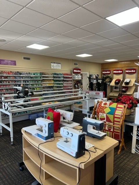 The Lee Sewing Center features a bright interior with shelves stocked full of colorful threads and sewing machines.