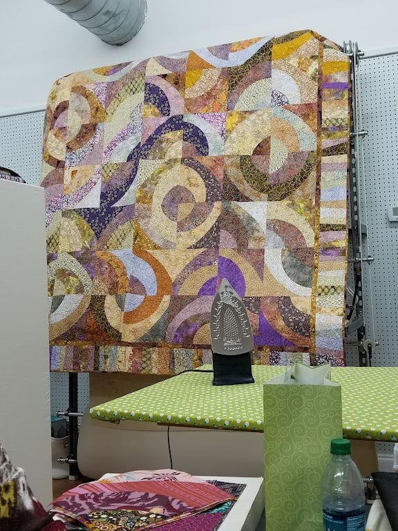 The image showcases a vibrant quilt featuring circular patterns in warm colors, displayed prominently in a sewing store.