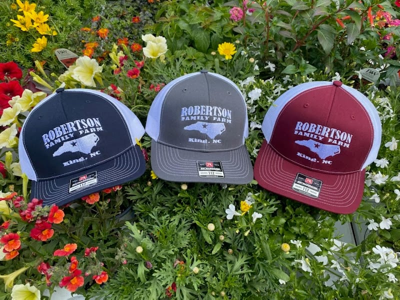 Three embroidered caps featuring "Robertson Family Farm" are displayed among vibrant flowers.