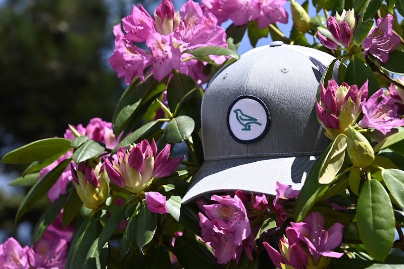 A gray cap with a bird logo is nestled among vibrant pink flowers. The setting showcases a natural outdoor environment, highlighting the cap's embroidery detail.