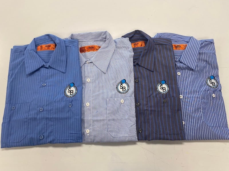The image showcases four neatly arranged button-up shirts in various shades of blue and striped patterns, each featuring a custom embroidery logo.