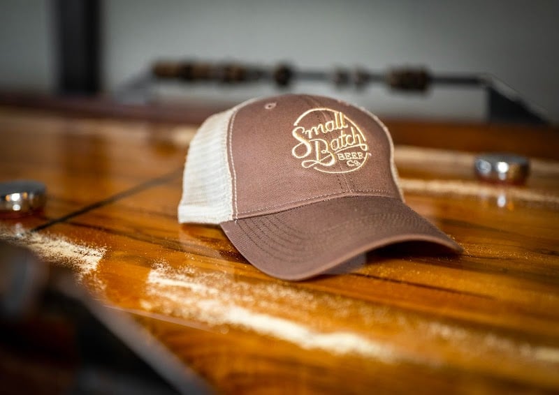 A brown and beige trucker hat with "Small Batch Beer Co." embroidered on it rests on a polished wooden surface.