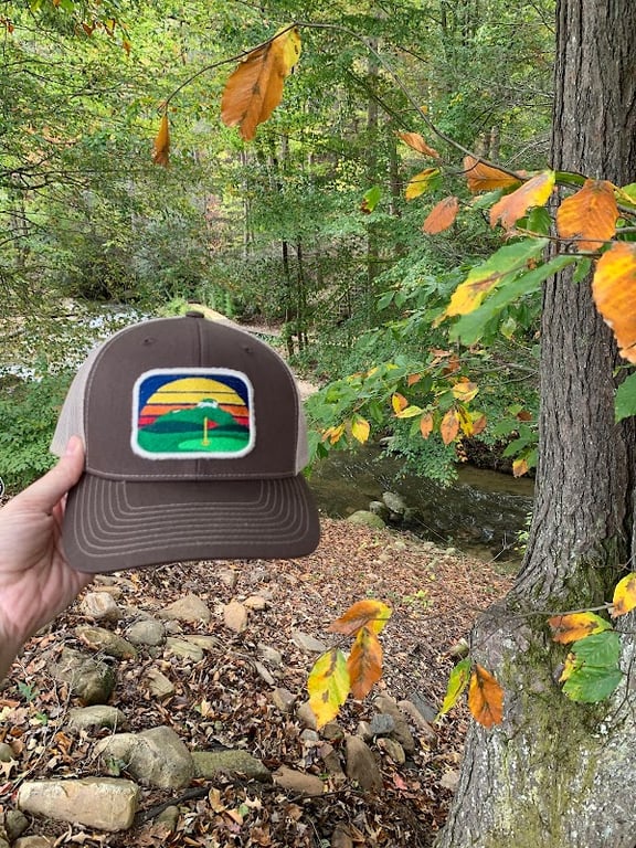 A person holds a brown cap featuring a colorful embroidered mountain design against a backdrop of vibrant autumn foliage and a flowing stream.