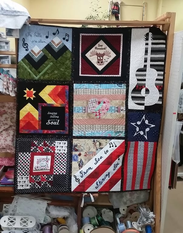 The image showcases a vibrant quilt display at Dakota Sew & So, featuring various colorful quilt blocks with musical and patriotic themes.