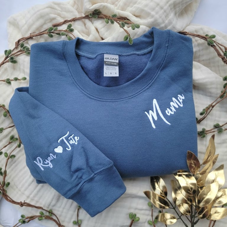 A blue sweatshirt featuring embroidered names "Mama," "Ryan," and "Tate" is displayed on a textured background with decorative greenery.