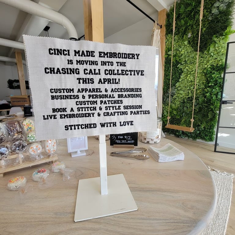 The image features a sign announcing Cinci Made Embroidery's move to Chasing Cali Collective, highlighting services like custom apparel and crafting parties.