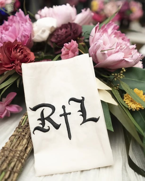 A close-up of an embroidered fabric featuring the initials "R L" is displayed among vibrant flowers, showcasing the artistry of Cinci Made Embroidery.