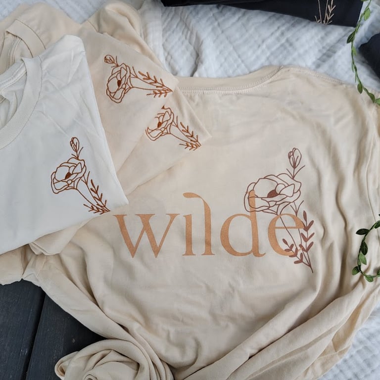 The image features several light-colored t-shirts with floral designs and the word "wilde" prominently displayed.