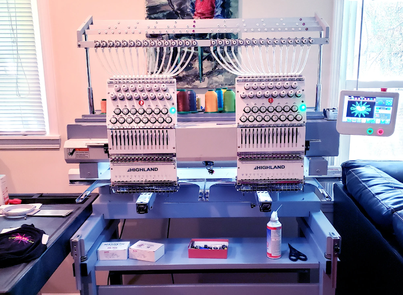 The image showcases a dual-head embroidery machine prominently displayed in a sewing store.