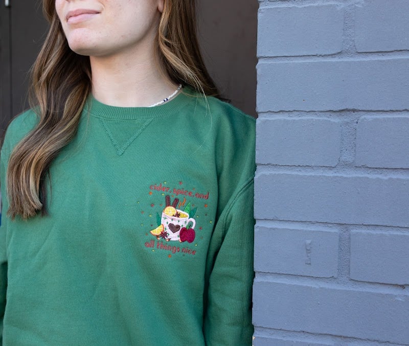 A woman stands beside a gray brick wall, wearing a green sweatshirt featuring a colorful embroidered design of a mug with fruits and the text "cider, spice, and all things nice.