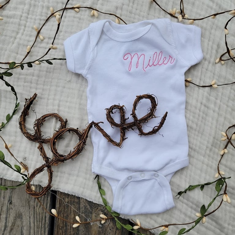 A white onesie with the name "Miller" embroidered in pink is displayed on a textured background, surrounded by decorative twigs forming the word "love.
